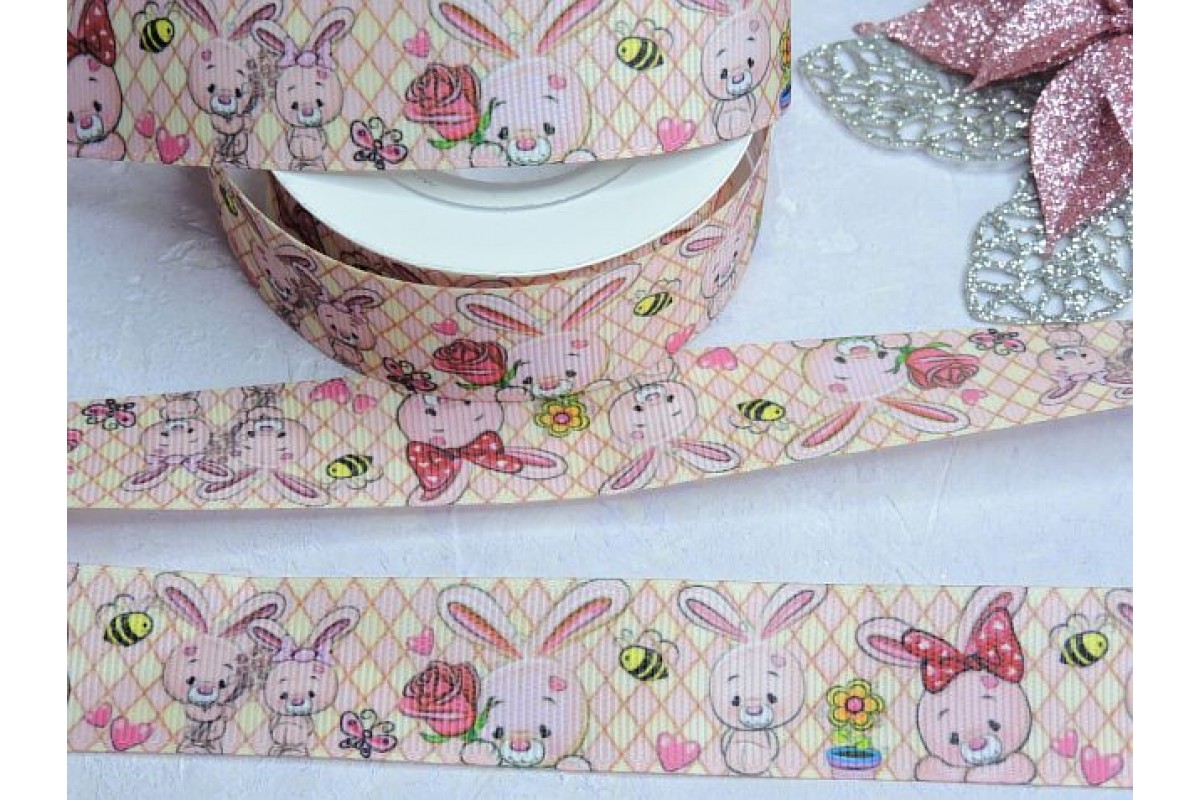 Лента репсовая 25 мм с рисунком "Зайчики" - 1 м.