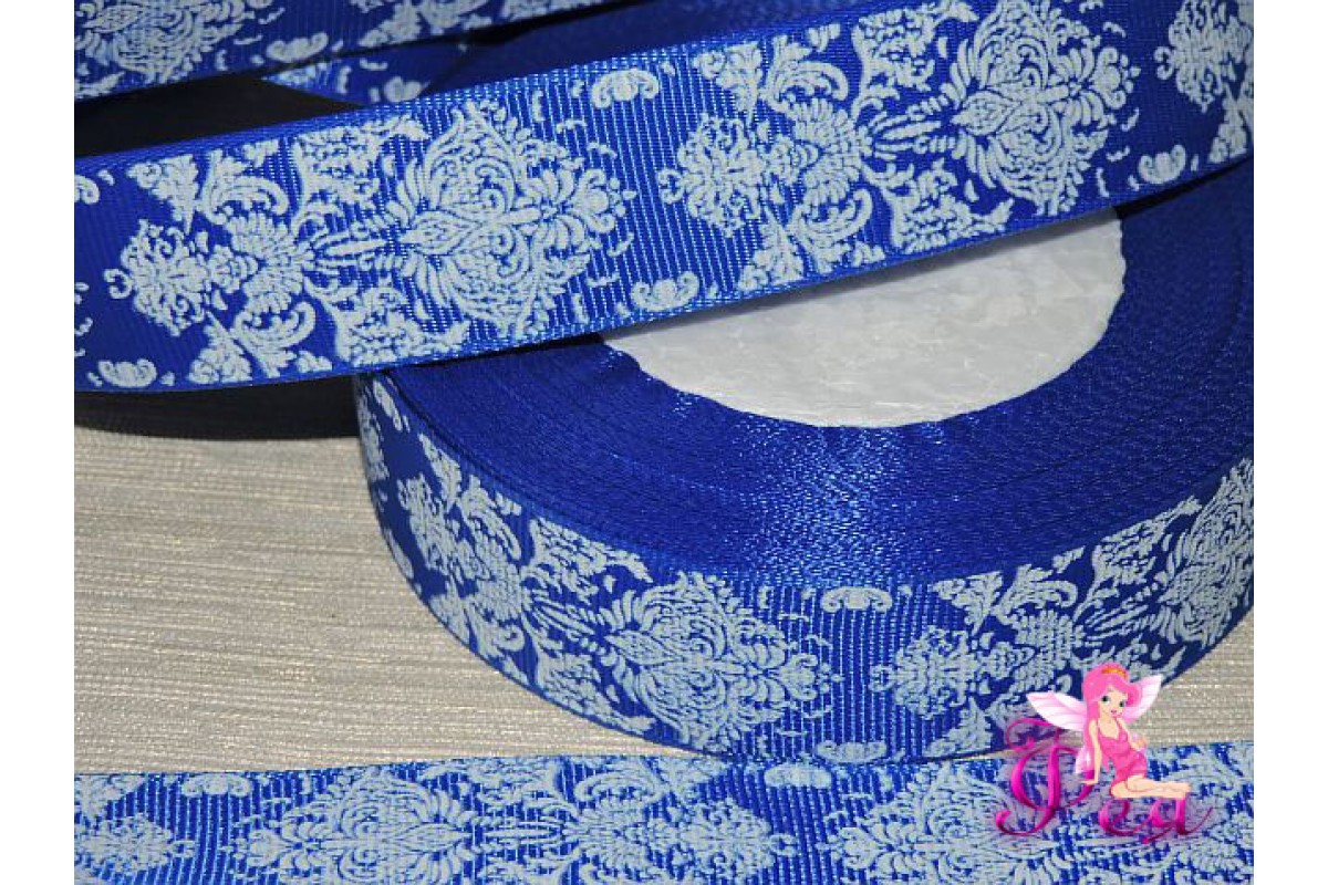 Лента репсовая 25 мм с рисункам "Дамаск", цв. белый/синий, 3781, Китай, 25 мм