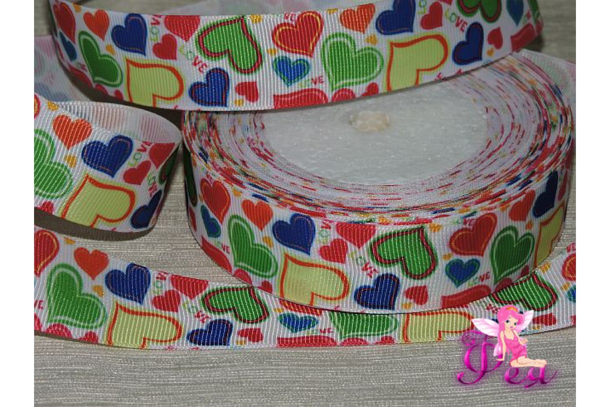 Лента репсовая 25 мм с рисунком "Цветные сердца"