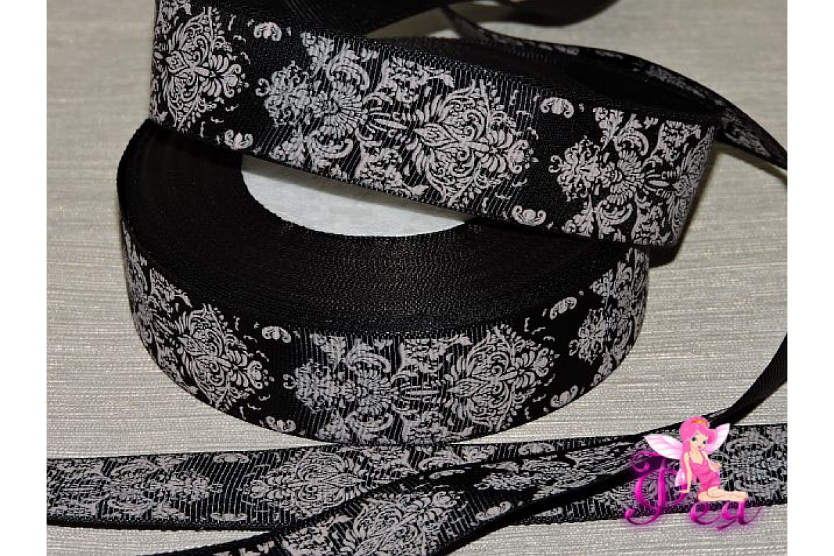 Лента репсовая 25 мм с рисунком "Дамаск" цв. черный/розовый