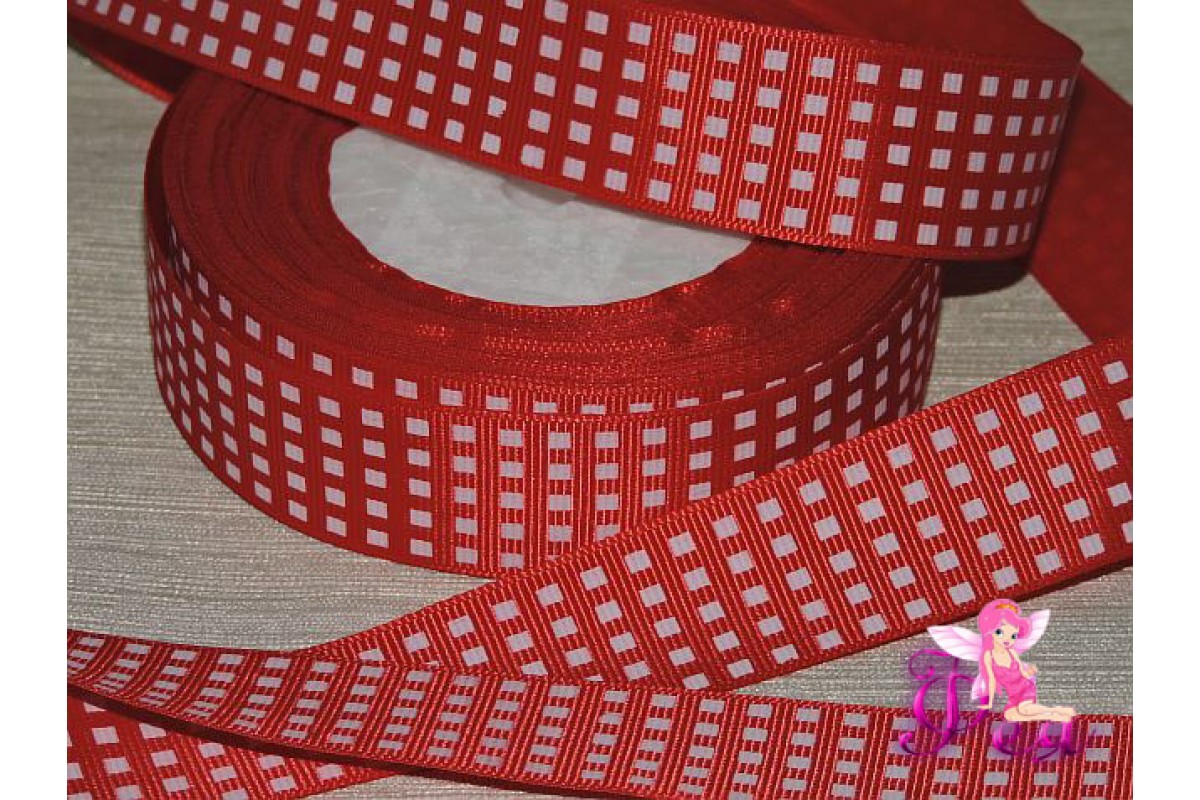 Лента репсовая 25 мм с рисунком "Клетка" цв. красный