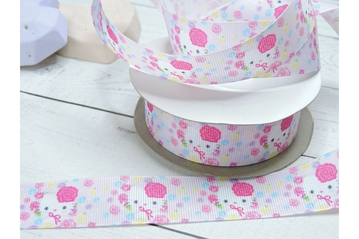 Лента репсовая с рисунком "Китти с розочками" 25 мм