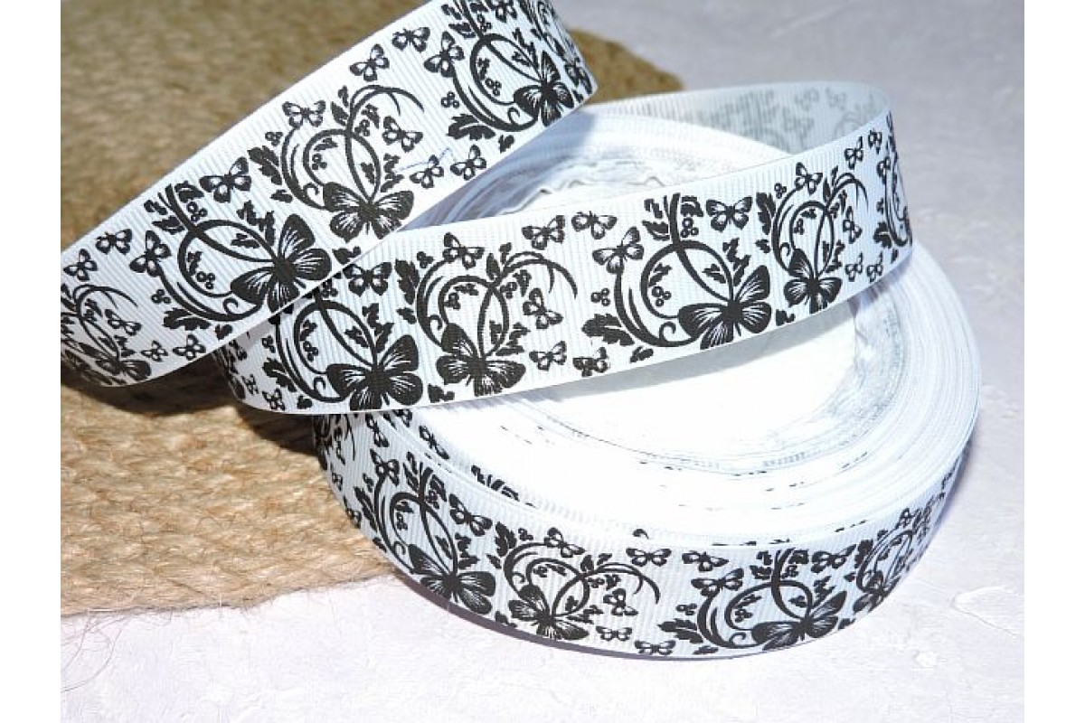 Репсовая лента 25 мм с рисунком "Бабочки черные", цв. белый - 1 м, 0235, Китай, 25 мм