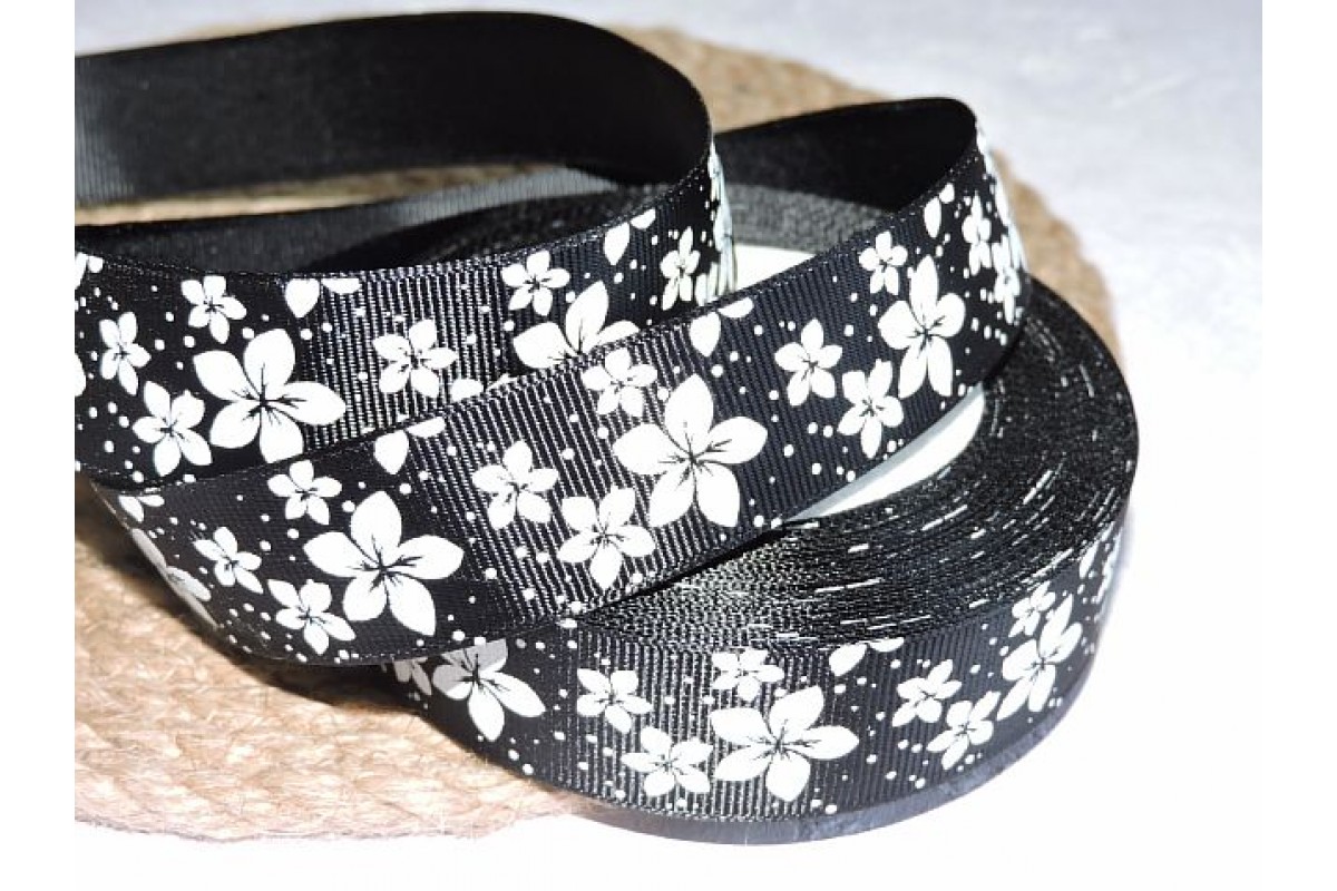 Репсовая лента 25 мм с рисунком "Белые цветочки", цв. черный - 1 м