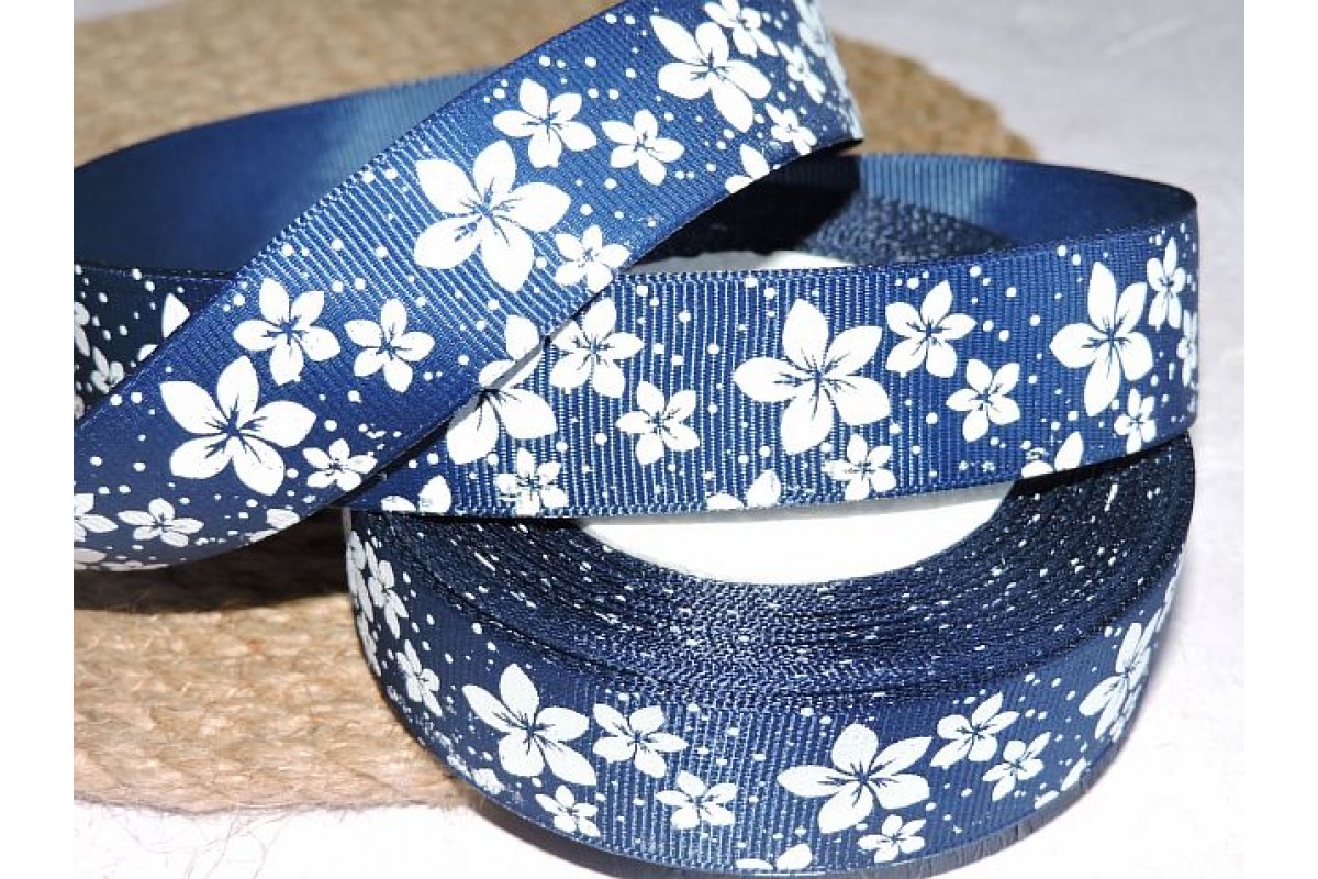 Репсовая лента 25 мм с рисунком "Белые цветочки", цв. темно-синий - 1 м, 0215, Китай, 25 мм
