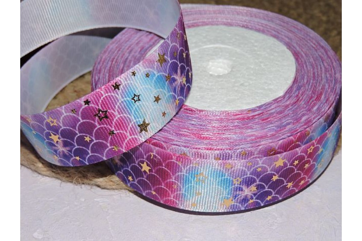 Репсовая лента 25 мм с рисунком "Чешую с серебряными звездочками", цв. розово-голубой - 1 м, 6413, Китай, 25 мм