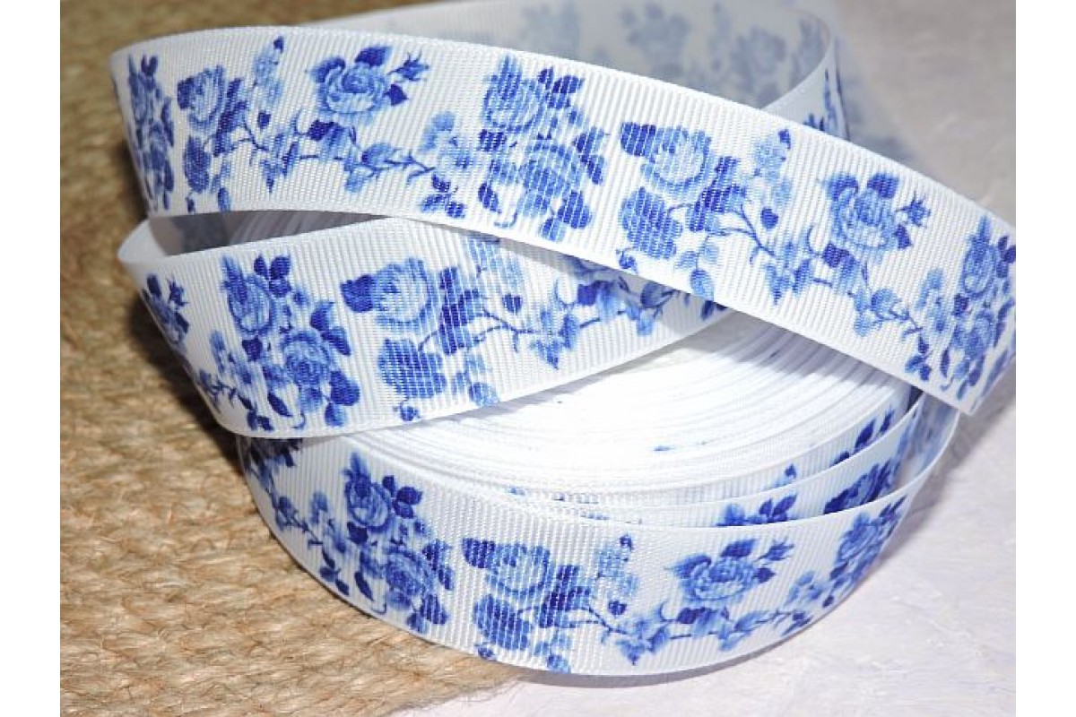 Репсовая лента 25 мм с рисунком "Гжель ", цв. белый - 1 м, 0205, Китай, 25 мм