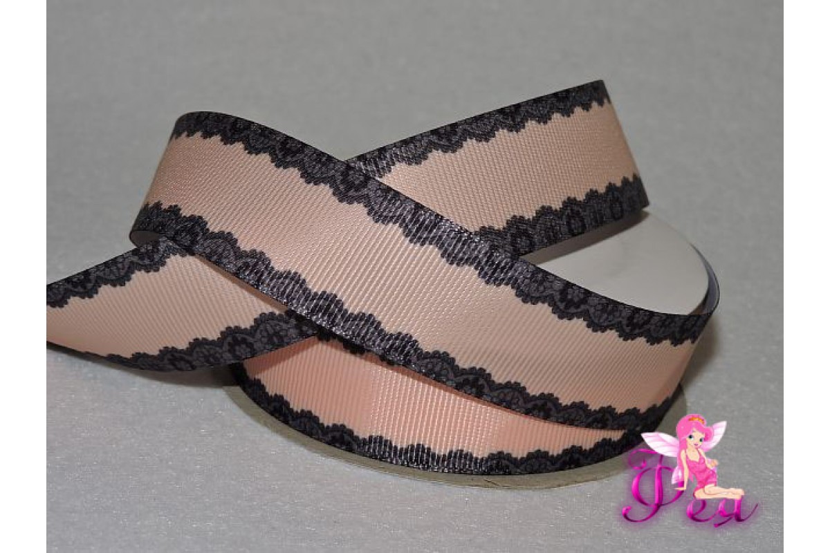 Репсовая лента 25 мм с рисунком " Кружево по краям", персиковый/черный - 1м