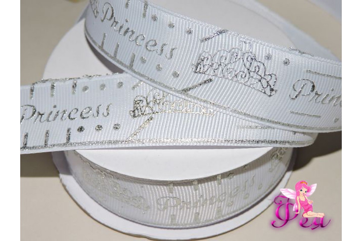 Репсовая лента 25 мм с рисунком "Princess", белый/серебро - 1м, 128-789, Китай, 25 мм