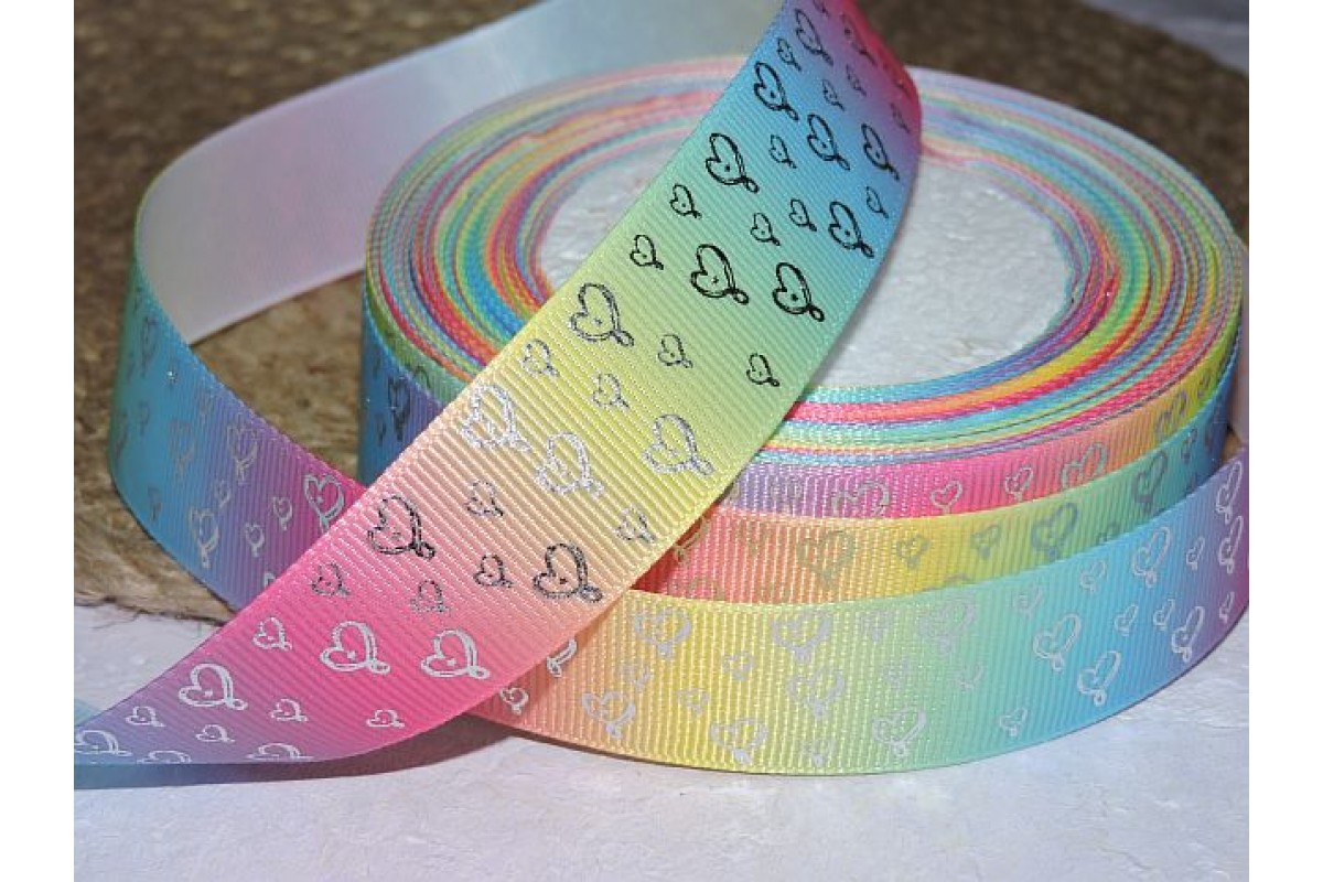 Репсовая лента 25 мм с рисунком "Радуга с серебряными сердечками", - 1 м