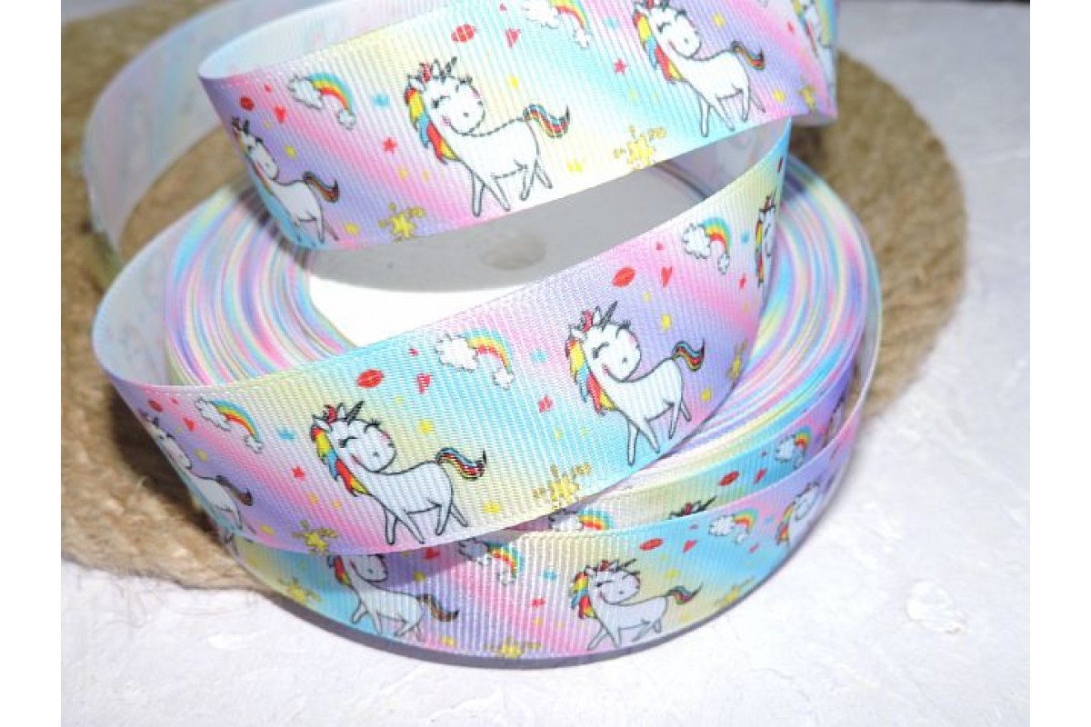 Репсовая лента 25 мм с рисунком "Радужные единороги", - 1 м, 2050, Китай, 25 мм