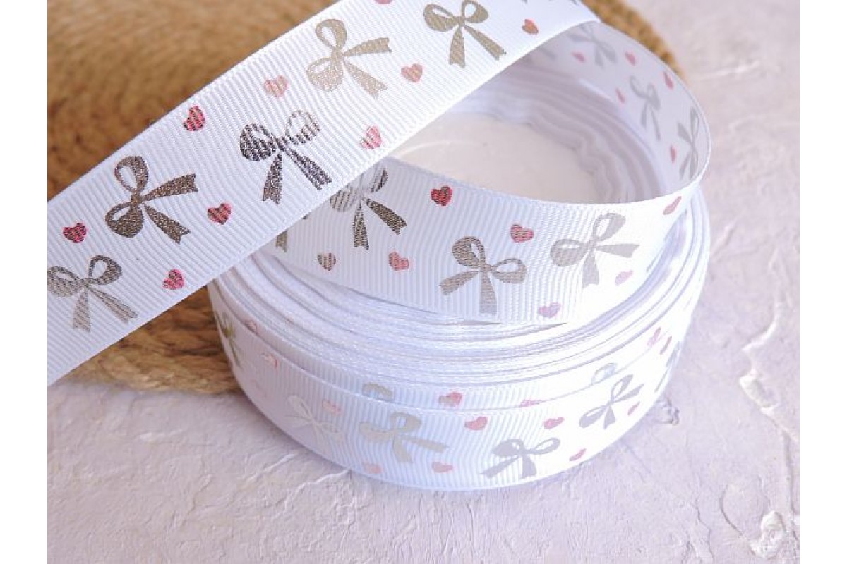 Репсовая лента 25 мм с рисунком "Серебряные бантики ", цв. белый - 1 м