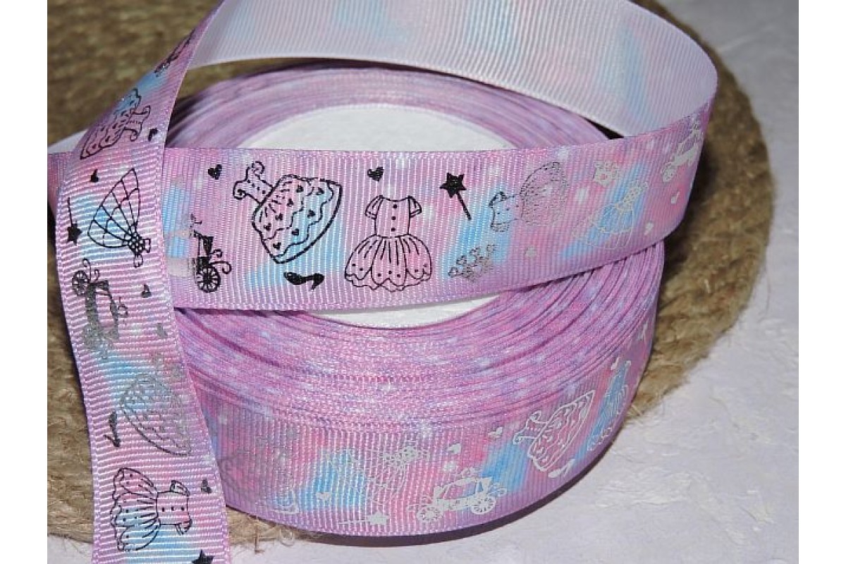 Репсовая лента 25 мм с рисунком "Серебряные платья и короны", цв. розово-голубой - 1 м