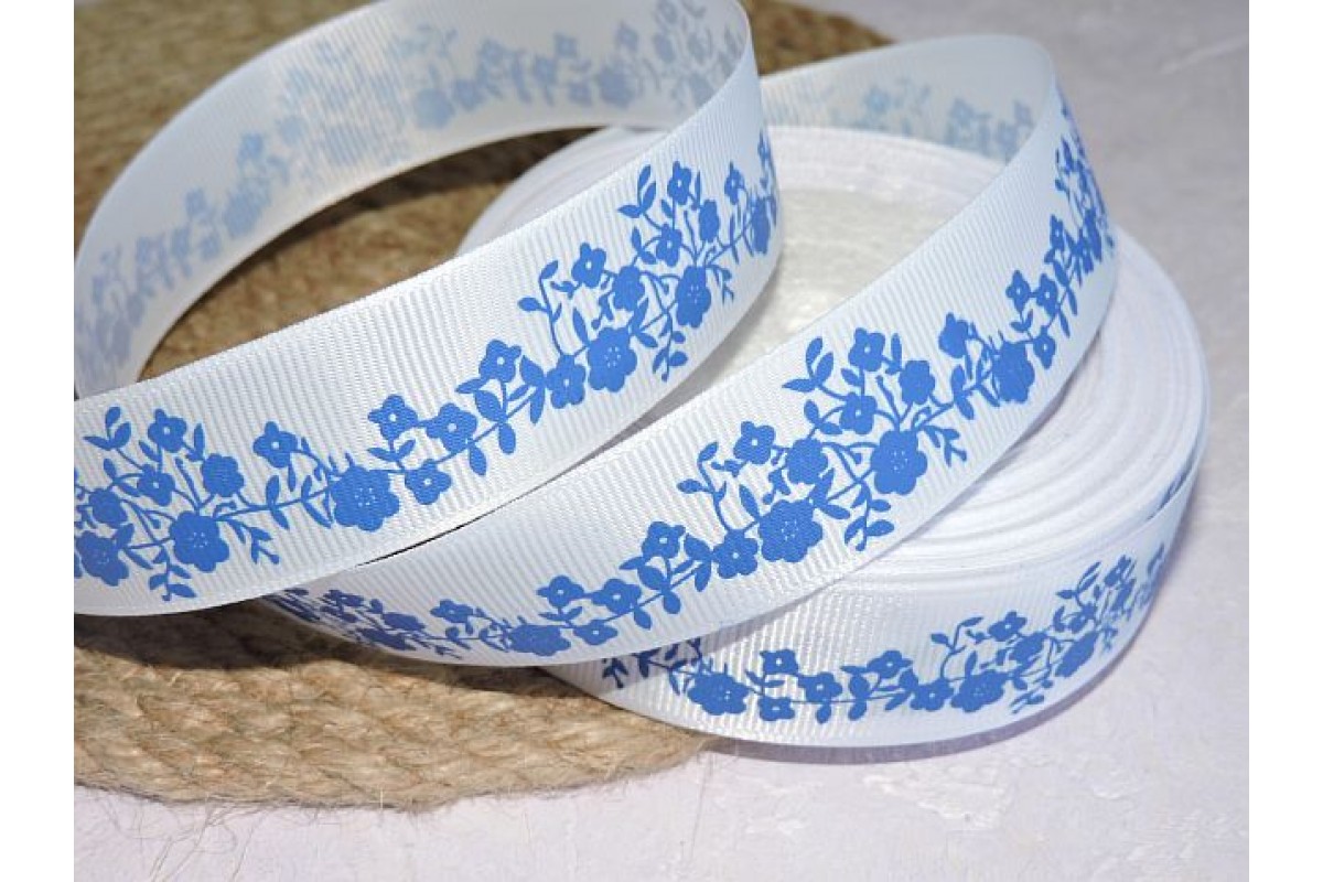 Репсовая лента 25 мм с рисунком "Синие цветочки", цв. белый - 1 м, 0210, Китай, 25 мм