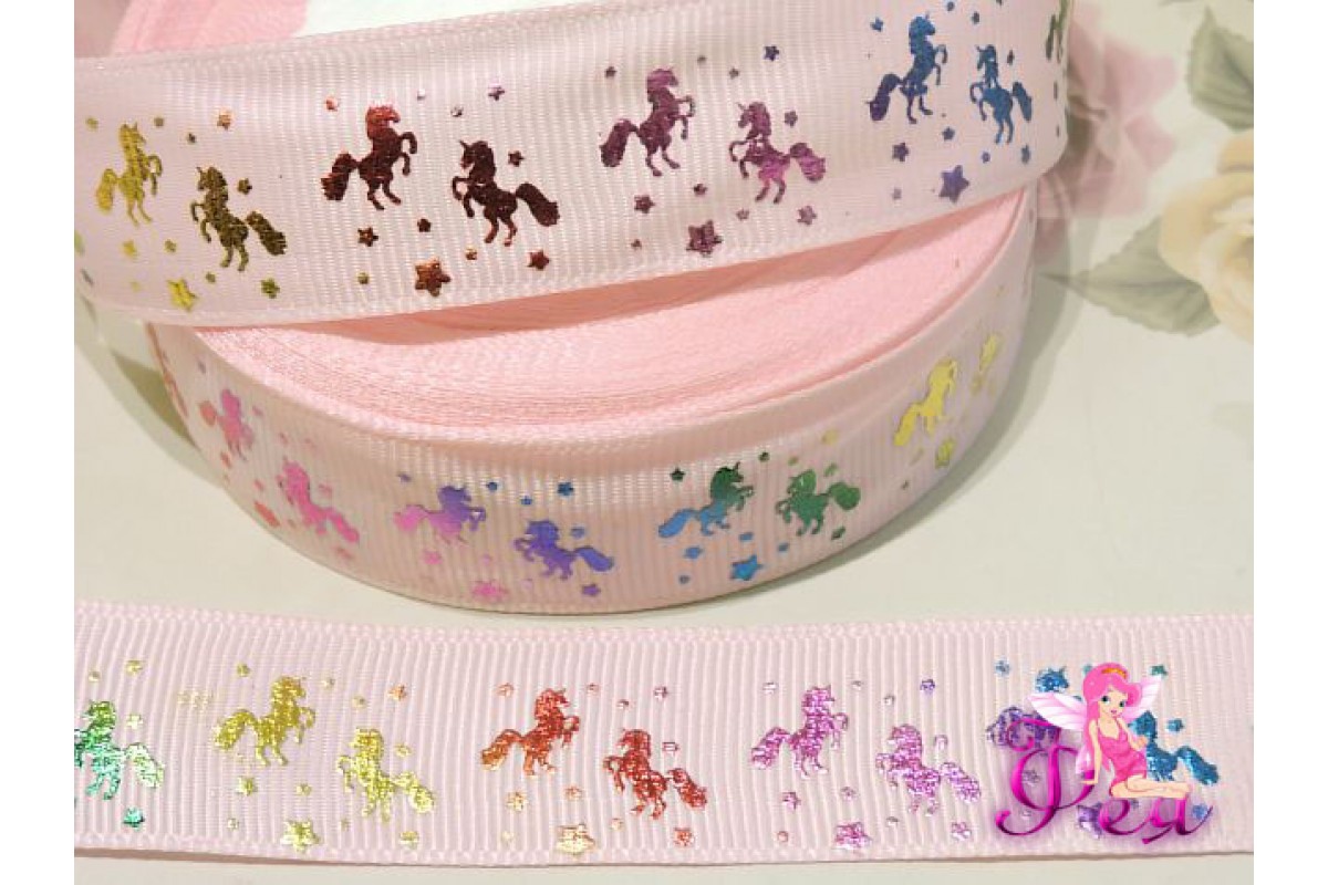 Репсовая лента с рисунком 25 мм, "Единороги" цв. розовый - 1м