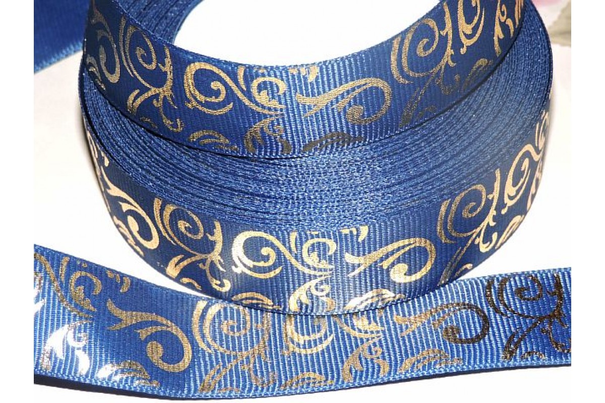 Репсовая лента с рисунком 25 мм, "Вензеля" , цв. темно-синий - 1м