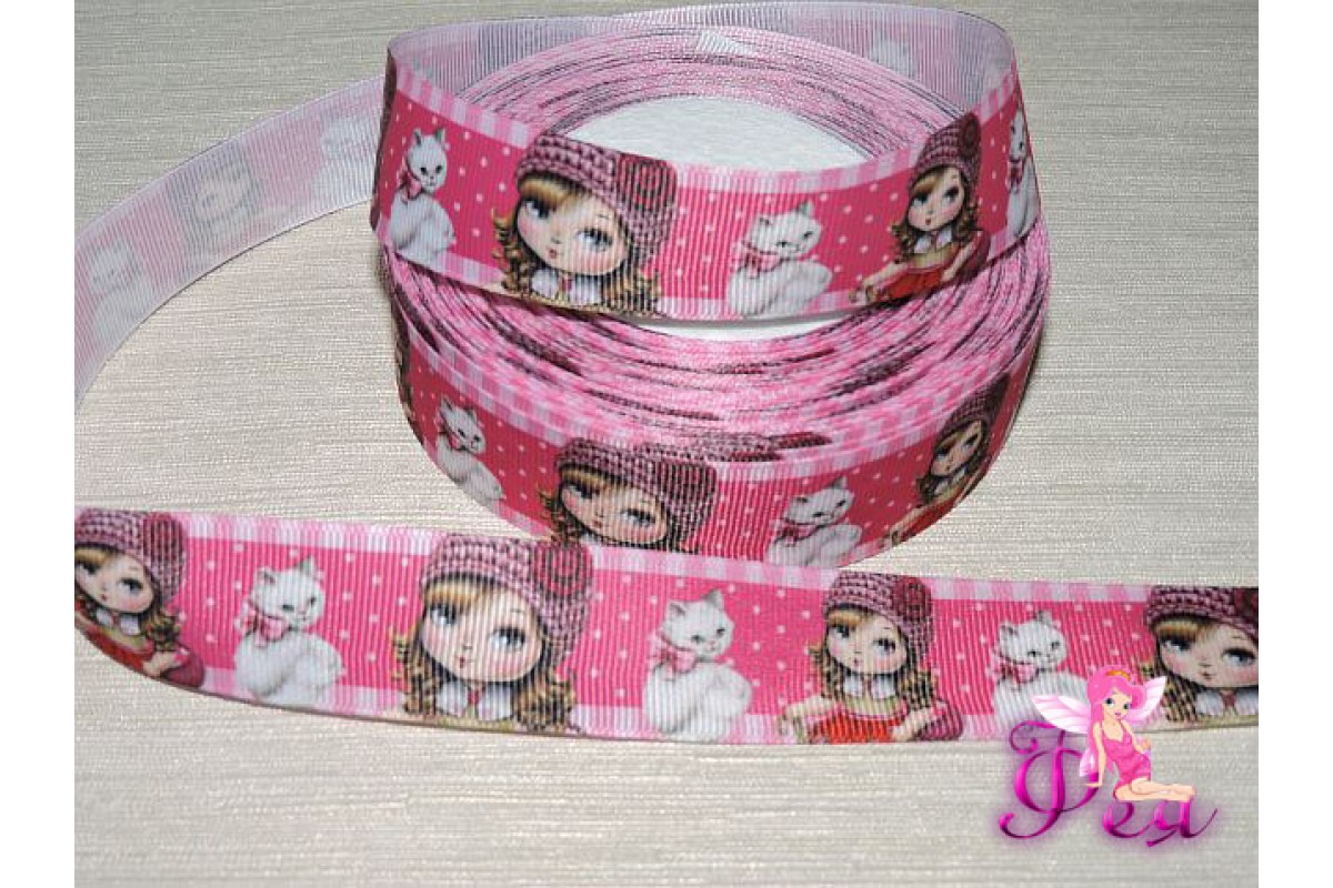 Репсовая лента 25 мм с рисунком 3D, "Девочка и кошка"., Д 60/80, Китай, 25 мм