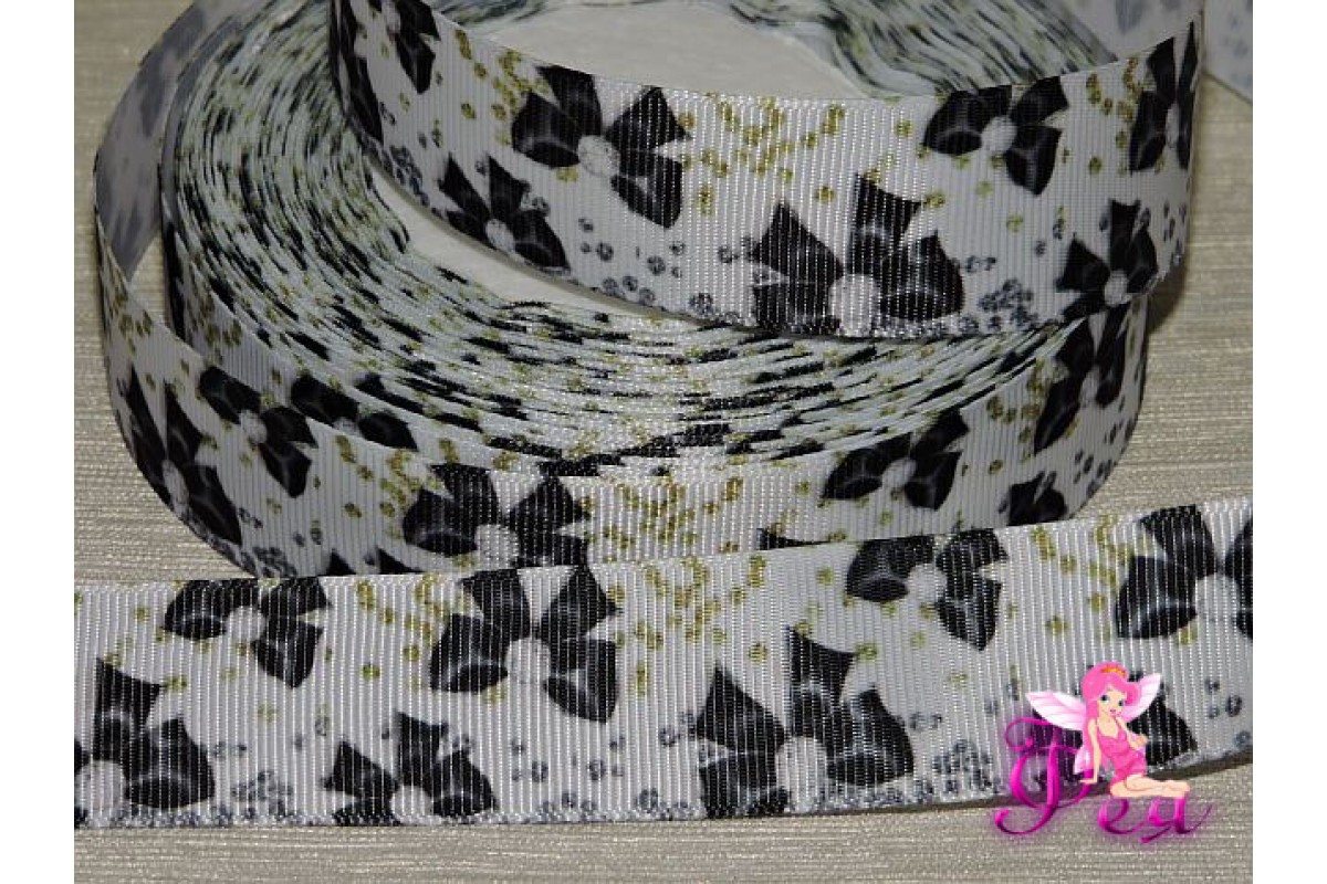 Репсовая лента 25 мм с рисунком "Черные бантики"
