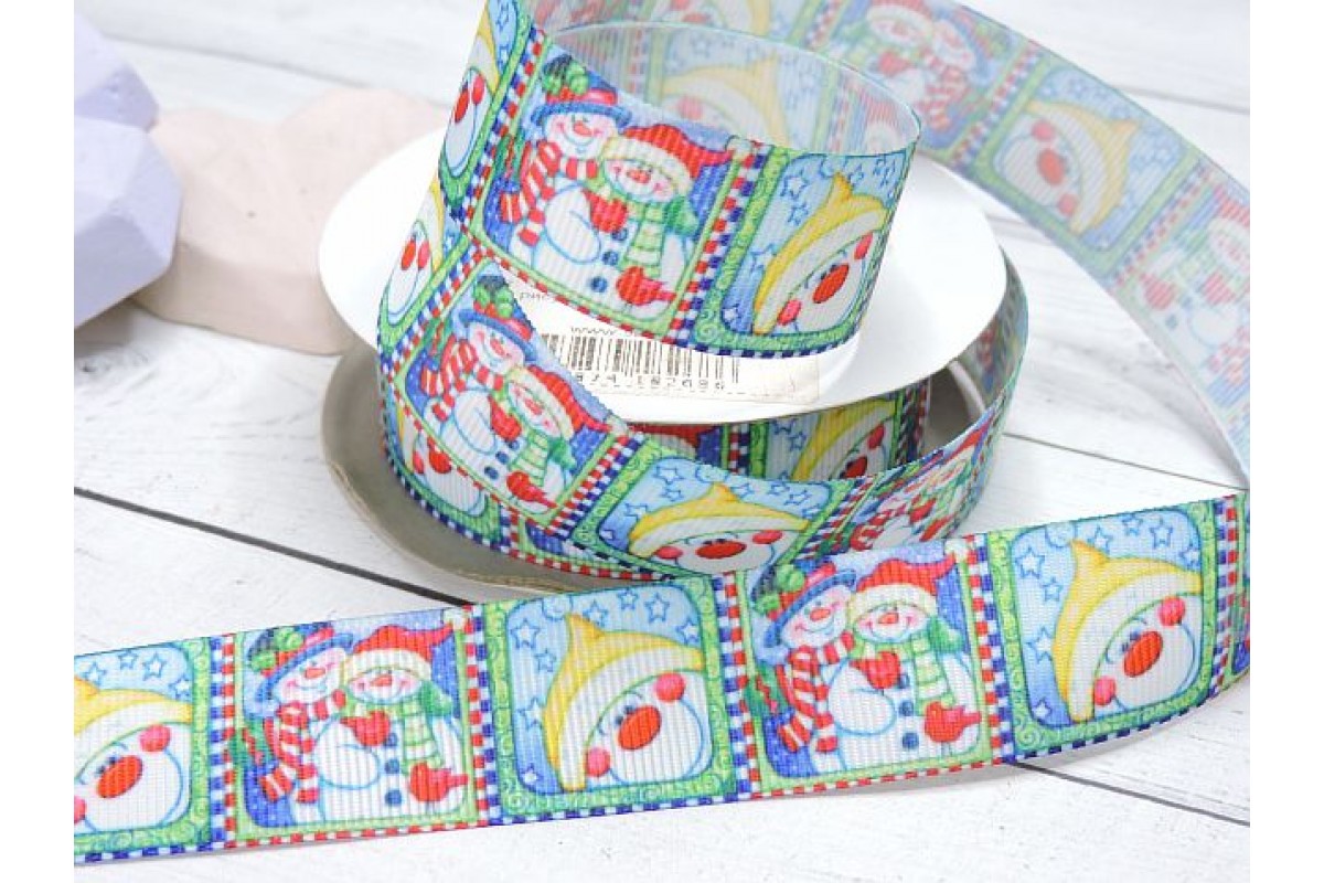 Репсовая лента 25 мм, с рисунком "Снеговики"