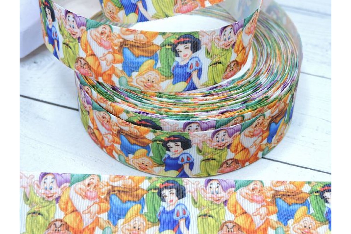 Репсовая лента с рисунком (мультики, 3D) 25мм, "Белоснежка и 7 гномов"