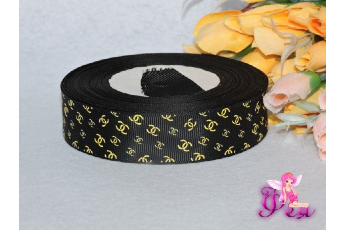 Репсовая лента с рисунком "Шанель золото" 25мм универсального черного цвета - 1м