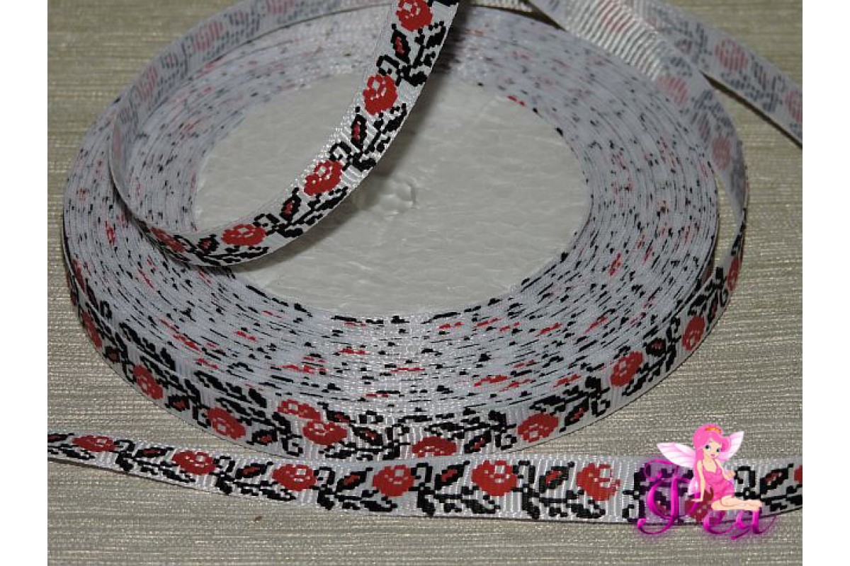 Репсовая лента 10 мм белого цвета с узором "Красный цветок с черным стеблем", Д 200/20, Китай, 6-12 мм