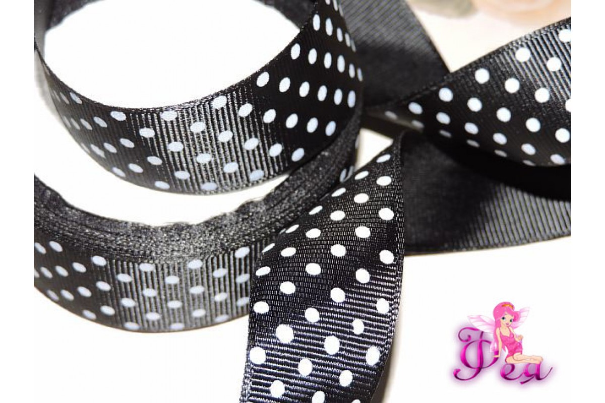 Репсовая лента 25 мм черного цвета с рисунком " Белый горох среднего размера"