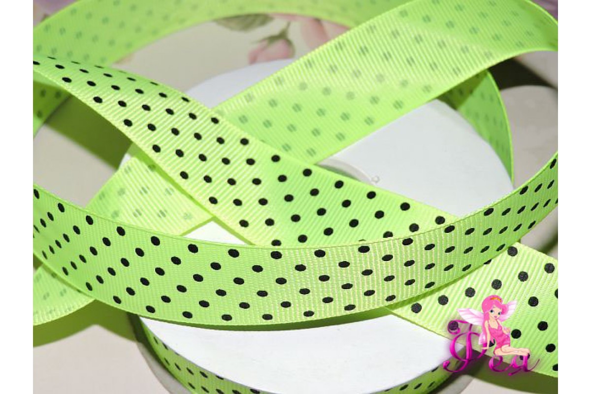 Репсовая лента 25 мм ярко-салатового цвета с рисунком "Мелкий черный горох" - 1м В5/7/11 25 мм