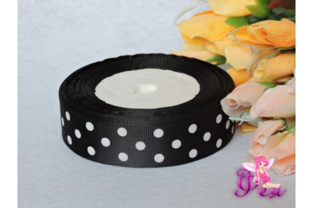 Репсовая лента 25 мм черного цвета с рисунком "Крупный белый горох"