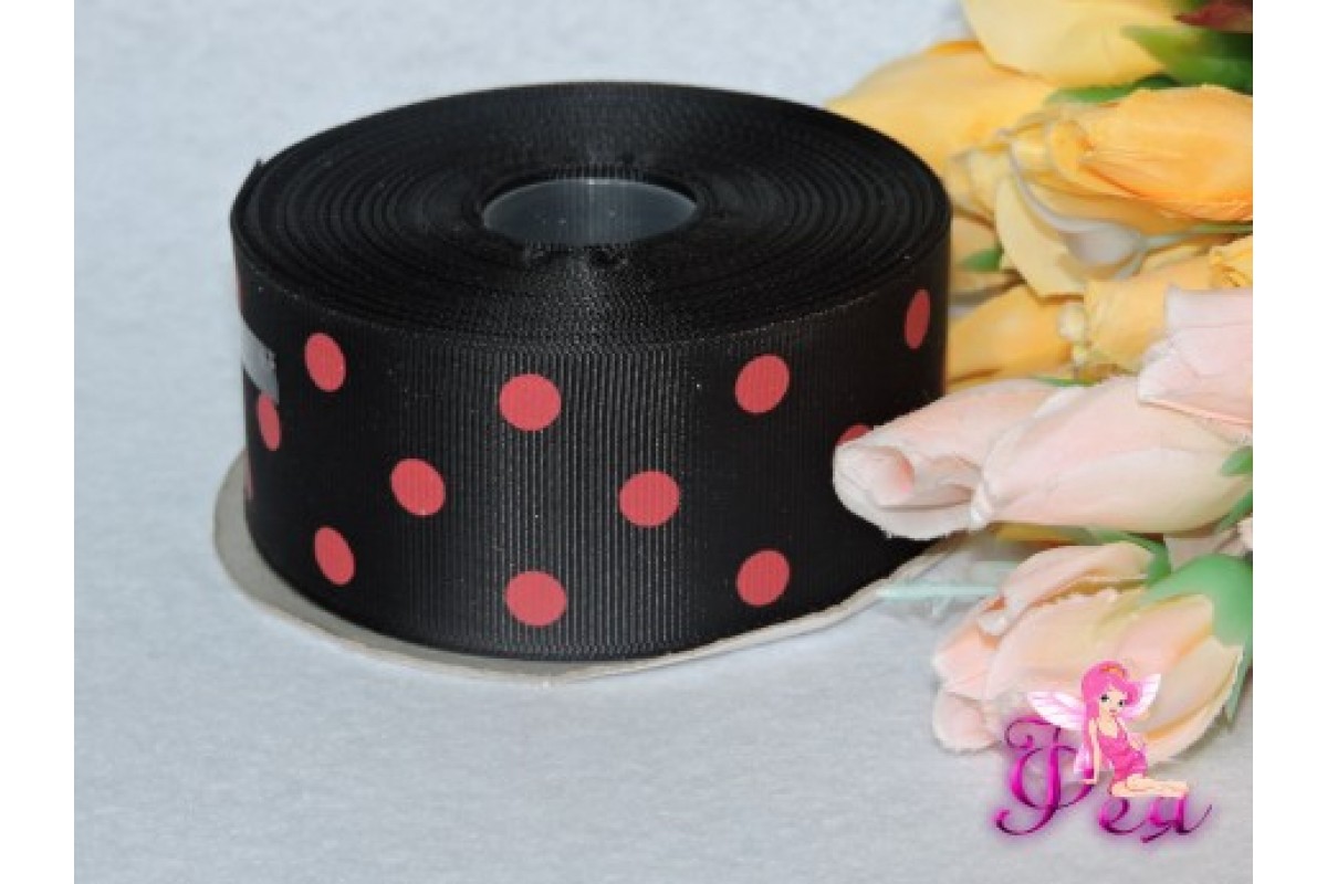 Репсовая лента 40 мм черного цвета с рисунком "Крупный красный горох"