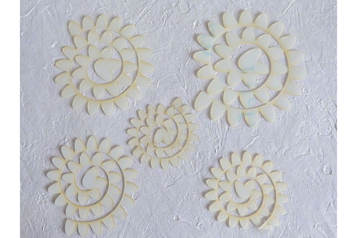 Шаблон "Цветочки 3" - 5 детали из гибкого пластика 0,7мм. Размеры 12 см, 10 см, 9 см, 8 см, 7 см.: Все детали в прозрачной пленке с двух сторон, ее нужно удалить перед началом работы.